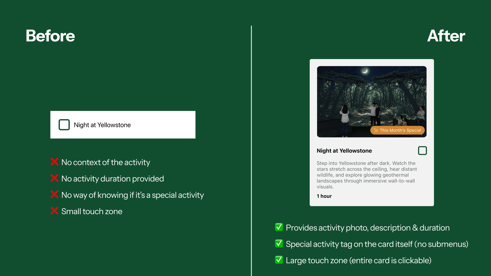 The booking process for Canopy was really confusing -customizing options gave no context, and special of the month activities were poorly highlighted, if at all.